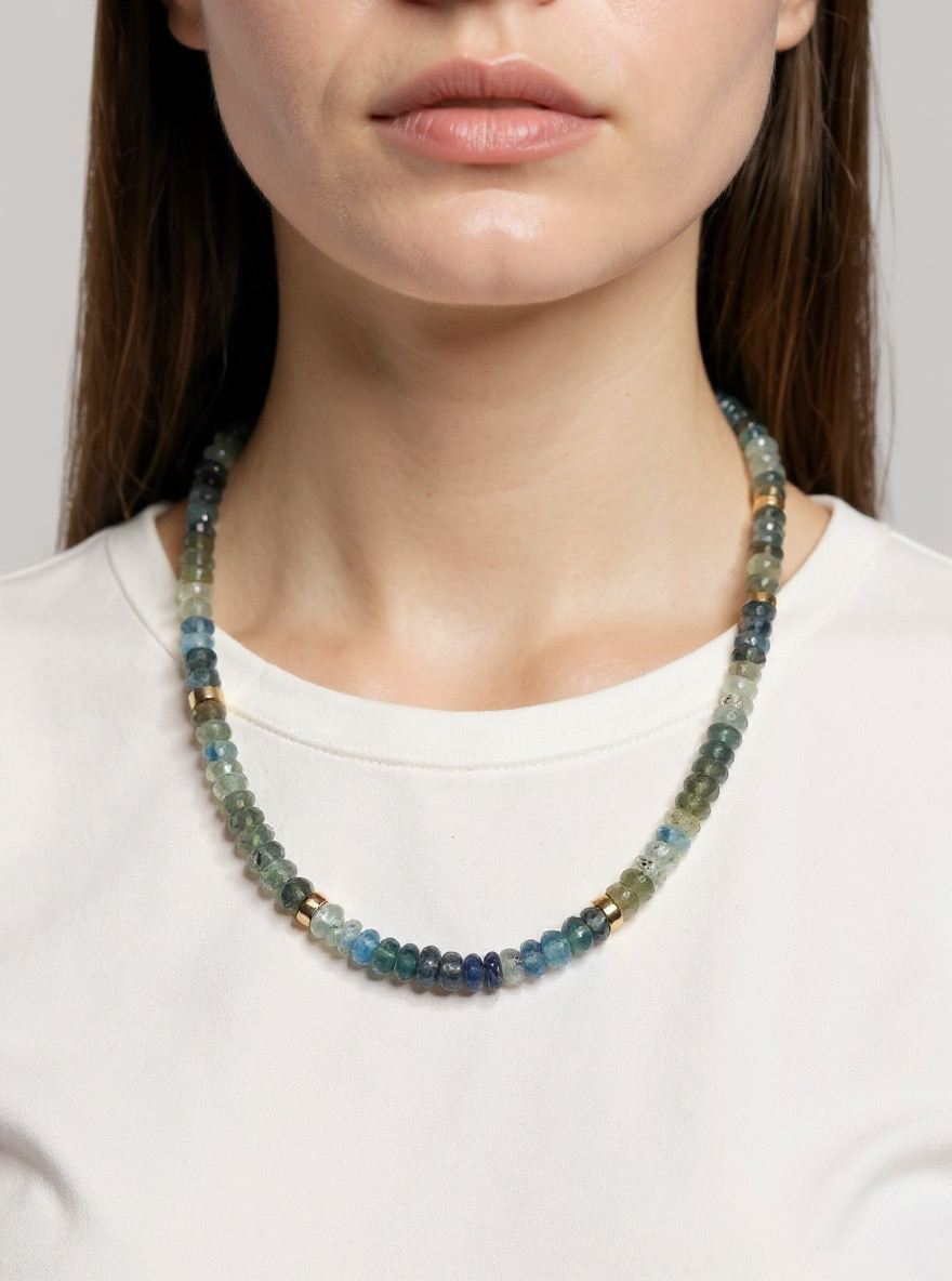 Delicate moss aquamarine 4mm with 14k gold filled detail rondelle and 14k gold filled clasp, 16” long.